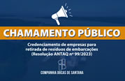 A Companhia Docas de Santana (CDSA) informa a abertura de Chamamento Público para credenciamento de pessoas jurídicas interessadas na prestação de serviços de retirada de resíduos de embarcações, conforme estabelecido pela Resolução ANTAQ nº 99/2023. O período de Credenciamento será de 18/02/2025 a 19/03/2025. A documentação necessária para o credenciamento está relacionada na Portaria nº 011 de 14 devereiro de 2025, disponível na íntegra no link http://www.docasdesantana.com.br/index.php/o-porto/legislacao O envio da documentação será para e-mail