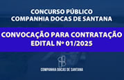 O Diretor-Presidente da Companhia Docas de Santana – CDSA, no uso de suas atribuições legais, torna pública a divulgação do Edital nº 001/2025 de convocação para cumprimento dos procedimentos necessários à contratação de candidato classificado no Concurso Público regido pelo Edital nº 01/2024, nos termos de seu item 2, para provimento de vaga no cargo de Operador de Equipamentos, que se encontrará disponível no dia 28 de março de 2025,no site da Companhia Docas de Santana: www.docasdesantana.com.br
